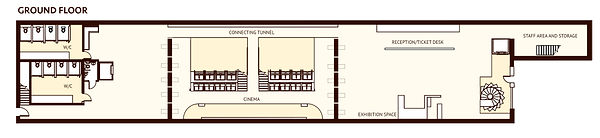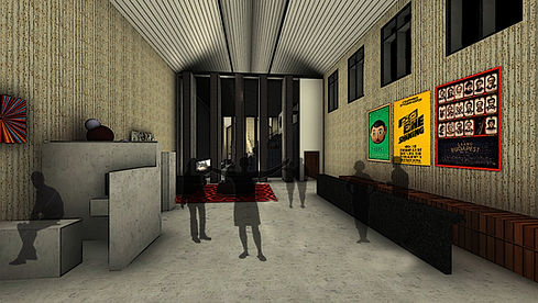 The building includes four clear sections. The first section is the man reception and ticket desk which sits beside a generous exhibition area for digital artists and also university art students to exhibit their work. The second section is the cinema, with it’s tunnel leading through connecting the exhibition area with the cafe, which is the third section of the building, and also acting as an exit for those in the cinema who wish to leave without interfering with the cinema’s large panels (swiveling doors).